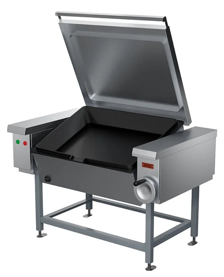 Опрокидывающаяся сковорода Проммаш СЭЧ-0, 45 используется на предприятиях общественного питания и торговли для жарения основным способом и во фритюре, для тушения, припускания, пассерования, а также для приготовления на пару мясных, рыбных, овощных блюд и кулинарных изделий. Сварной каркас выполнен из черного металла с порошковым покрытием, облицовки - из углеродистой стали с покрытием, чаша - из чугуна, передняя облицовка и крышка - из нержавеющей стали.