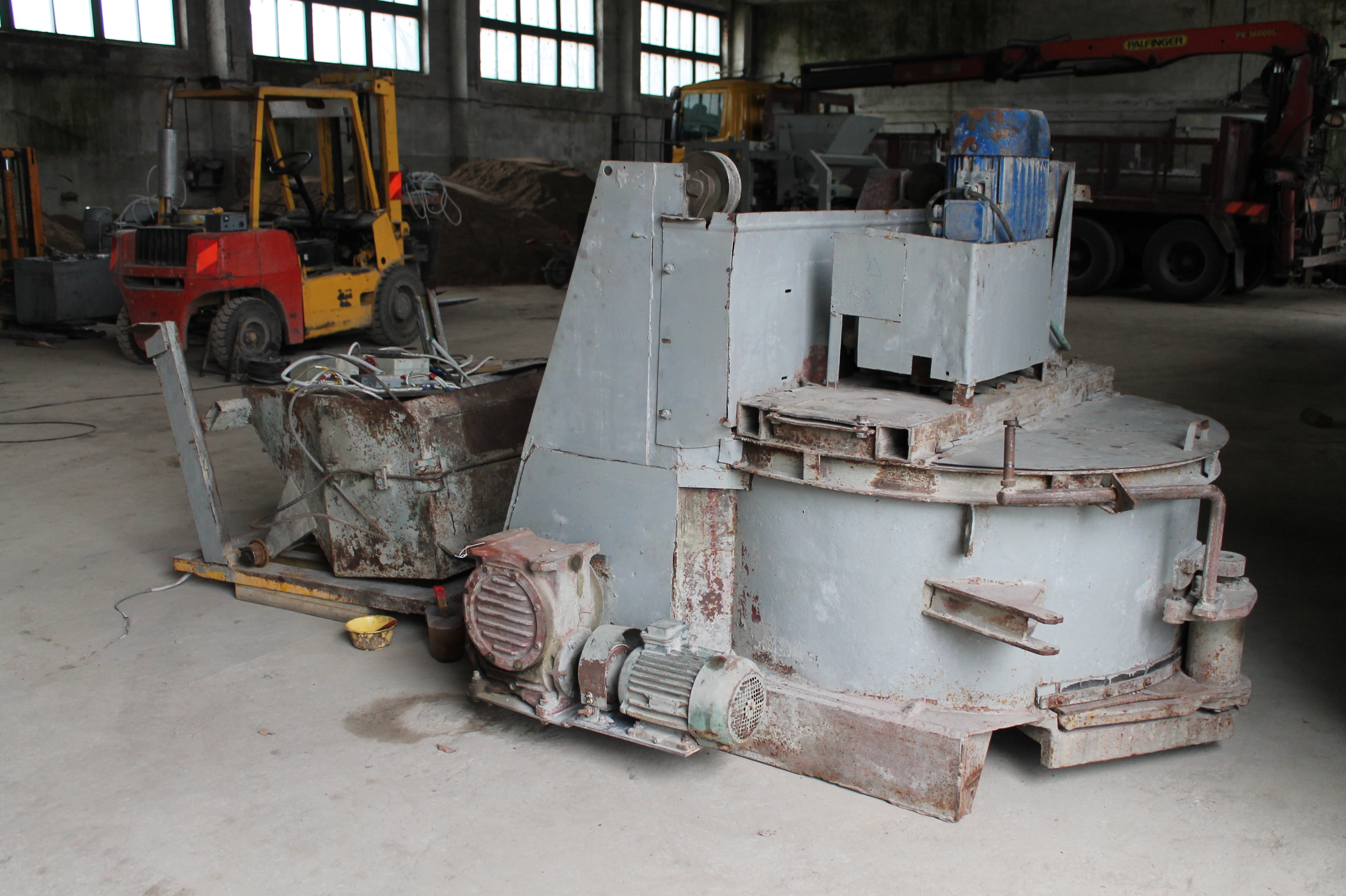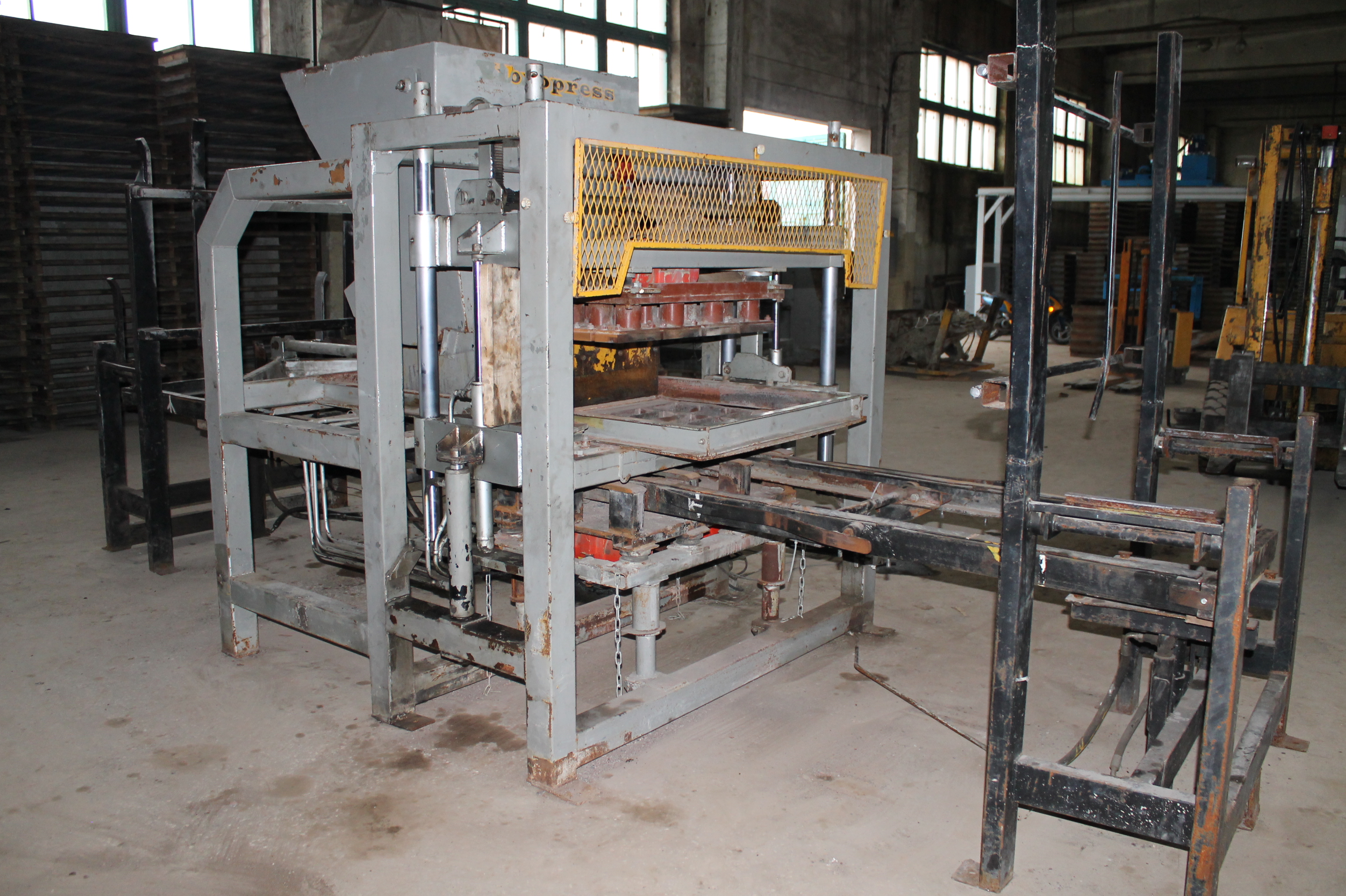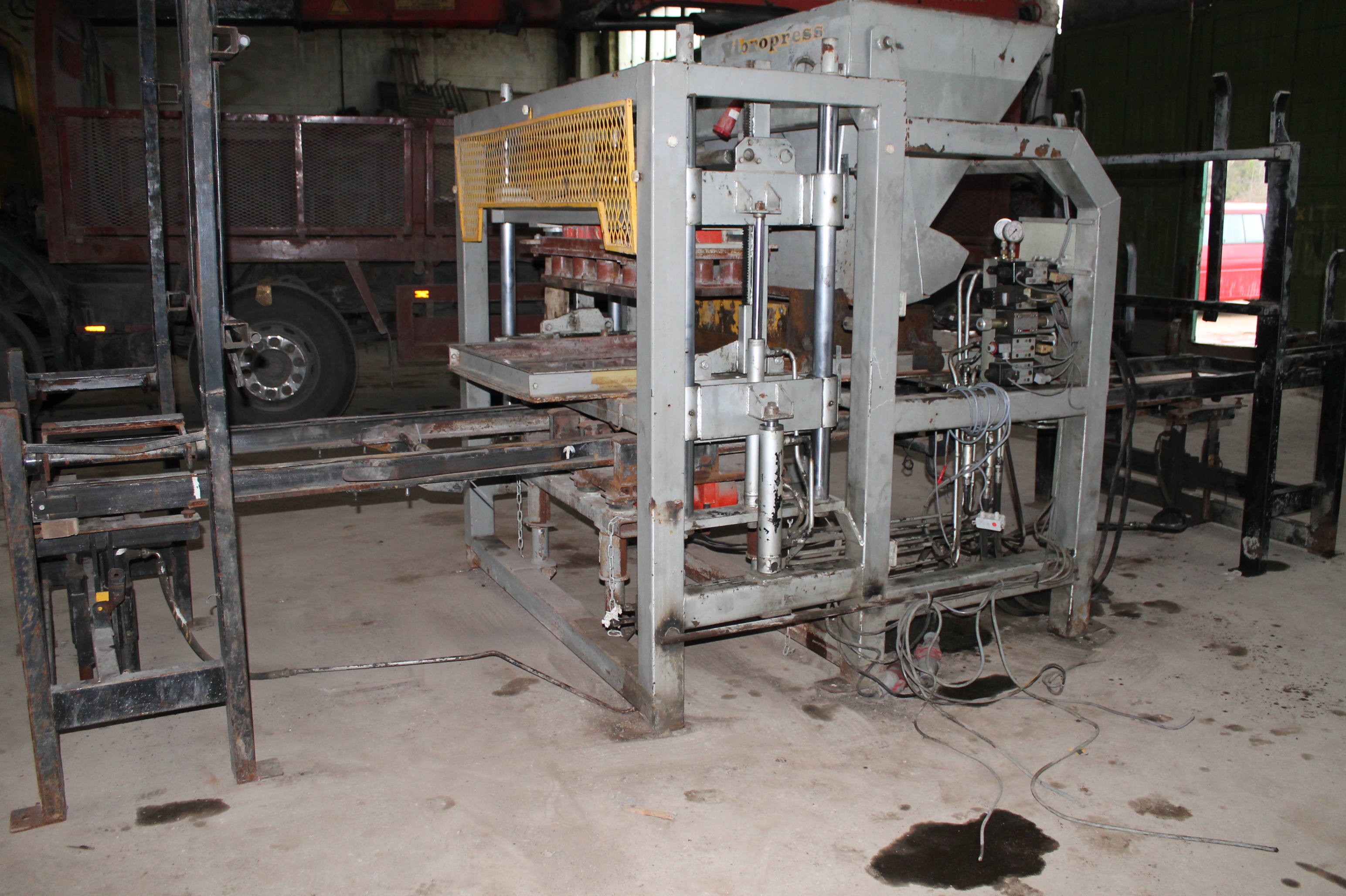 вибропресс, гидроузел, пульт управления(в полуавтоматическом режиме), смеситель со скипом, шнековой транспортер для заполнения цемента, обемный дозатор цемента, ленточный транспортерь для перегрузки готовой смеси из смесителя в бункер преса, пресформа на плитку.