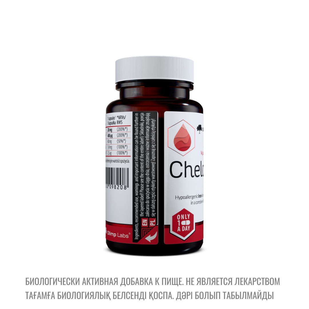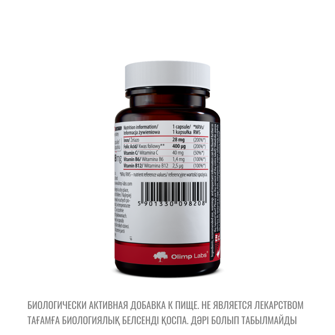 Состав: железа бисглицинат (хелат аминокислоты железа Ferrochel™); агент антислеживающий - микрокристаллическая целлюлоза, магниевые соли жирных кислот; мальтодекстрин; L-аскорбиновая к-та (витамин C); цианокобаламин (витамин B12), пиридоксин гидрохлорид (витамин B6), птероилмоноглутаминовая к-та – фолат, капсула (желатин, краситель E172).