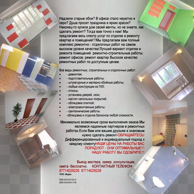 Внутренняя отделка домов, коттеджей, офисов - капитальный ремонт -Евро ремонт -Все виды сантехнических и электрических работ. Все виды отделки. Бригада профессиональных мастеров выполнит ремонтно — отделочные работы качественно и в срок! Цель нашей работы — высококачественный ремонт офисов, квартир, в короткие сроки и за разумные деньги. Мы даем гарантию на все виды отделочных работ, ремонт офисов, квартир и гарантируем нашим клиентам высокое качество работ, доброжелательное отношение, индивидуальный подход. С каждым клиентом заключается договор, что служит гарантией выполнения работ и надлежащего качества. Цена ремонта офиса или квартиры определяются сложностью и объемом работ. Бесспорно, например, ремонт квартиры уровня евроремонт существенно дороже косметического ремонта квартиры и по используемым материалам, и по стоимости отделочных работ.