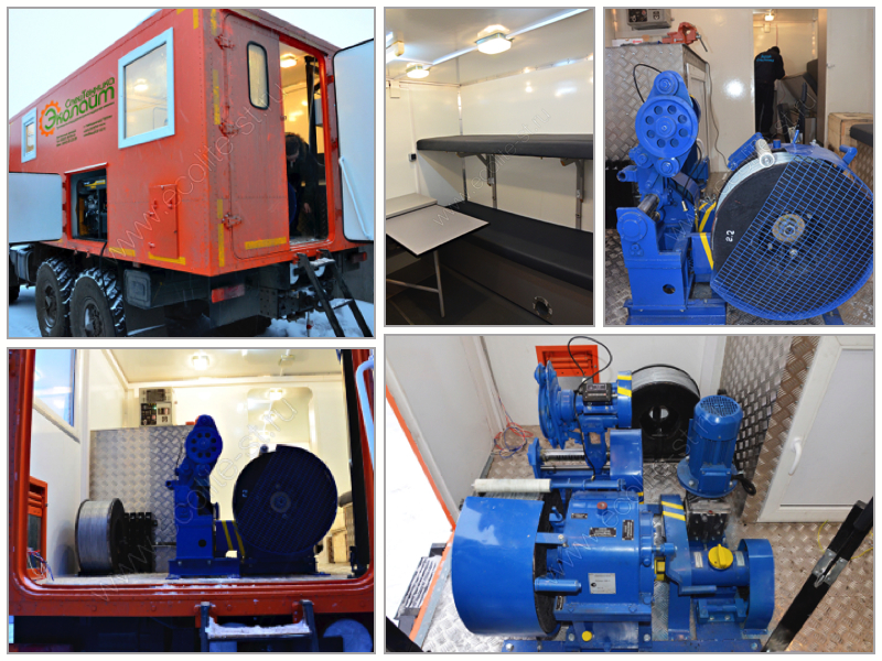 ЛЕБЕДОЧНЫЙ ОТСЕК: лебедка исследовательская (ЛИС) с приводом на выбор: электрический, механический, гидравлический, электромеханический; кран-укосина для монтажа барабана; система контроля спуско-подъемных операций (СК-СПО); автономная электростанция 220/380В; щит питания и защиты; розетки; автомобильные принадлежности; пульт с дублерами контрольных приборов двигателя шасси.