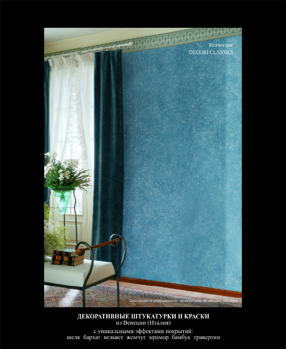 Decori Classici - декоративная отделка высокого качества, для внутренних работ, основанная на многотональных переплетениях белых нерастворимых флокул, образующих ажурную вязь, подобную невесомой ткани. С помощью аналогичной техники росписи стен декорированы изысканные и оригинальные помещения античных зданий эпохи Возрождения. Легкость нанесения и широкая хроматическая гамма, позволяют создать атмосферу престижа, облагораживая внутренние помещения частных домов, рабочие пространства, ресторанов, офисов, торговых и представительских интерьеров.